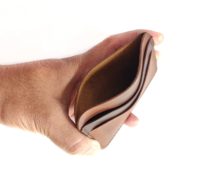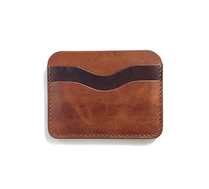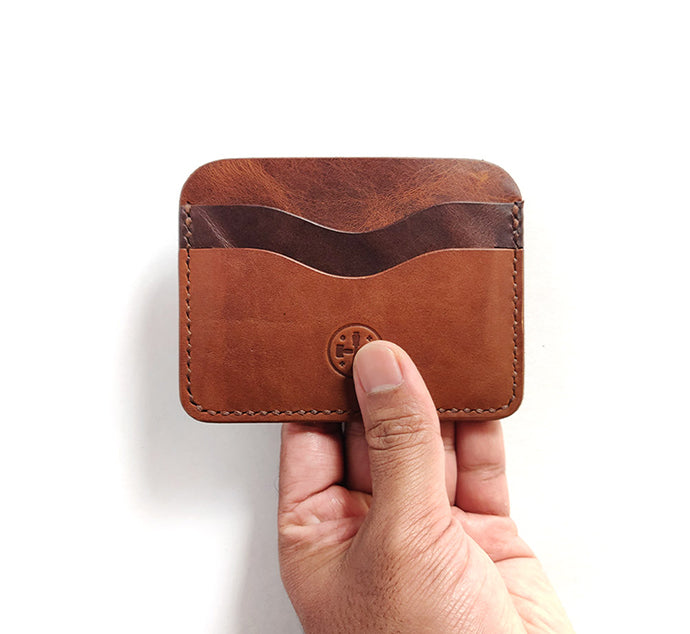 डुअल टोन में एक आसान प्रकार का वॉलेट, इंग्लिश टैन और चेस्टनट ब्राउन का एक सुंदर मिश्रण। बीच में नकदी और किनारे पर कार्ड रखने की जगह, फोक वॉलेट को इससे अधिक न्यूनतर नहीं बनाया जा सकता।